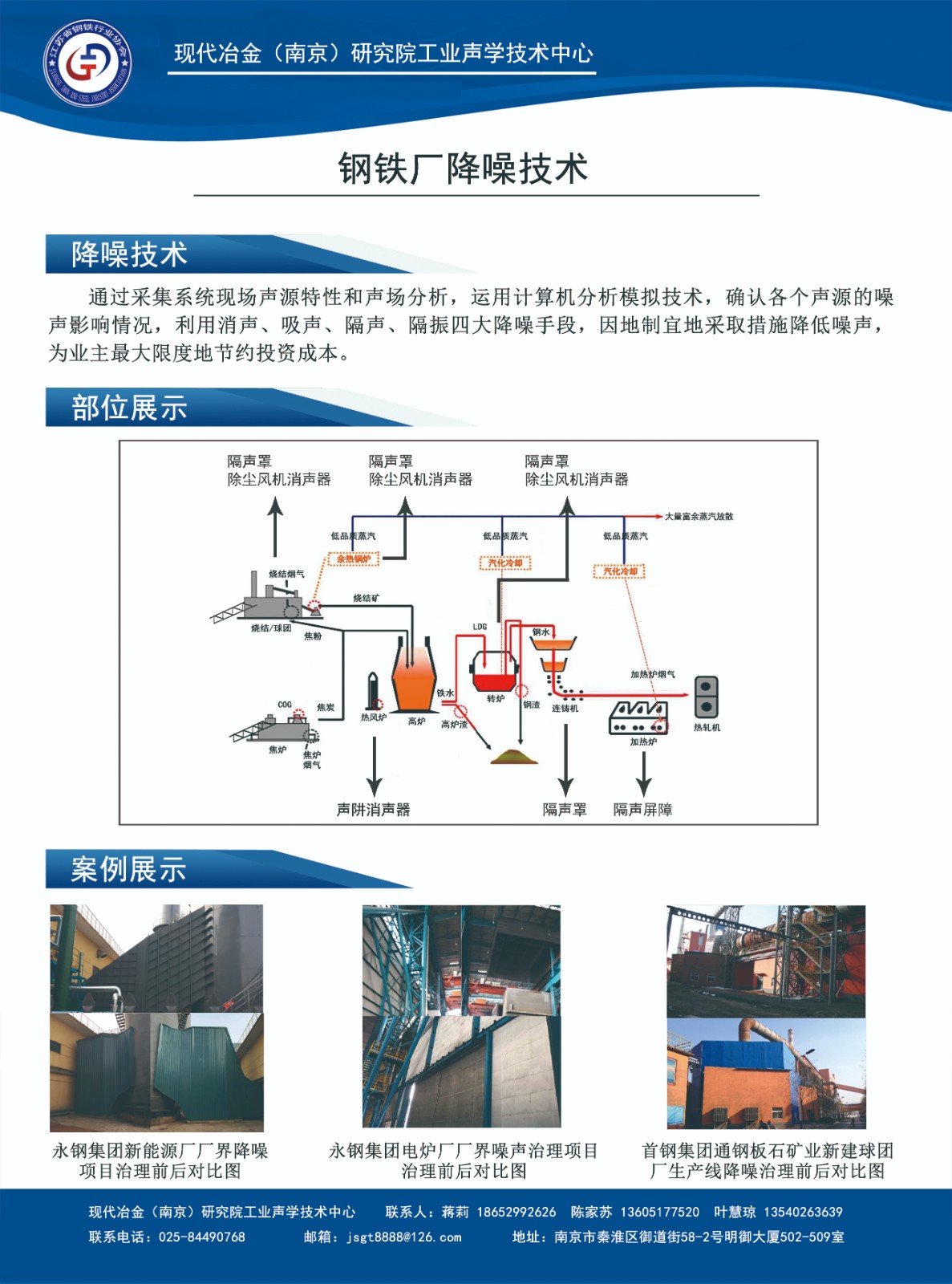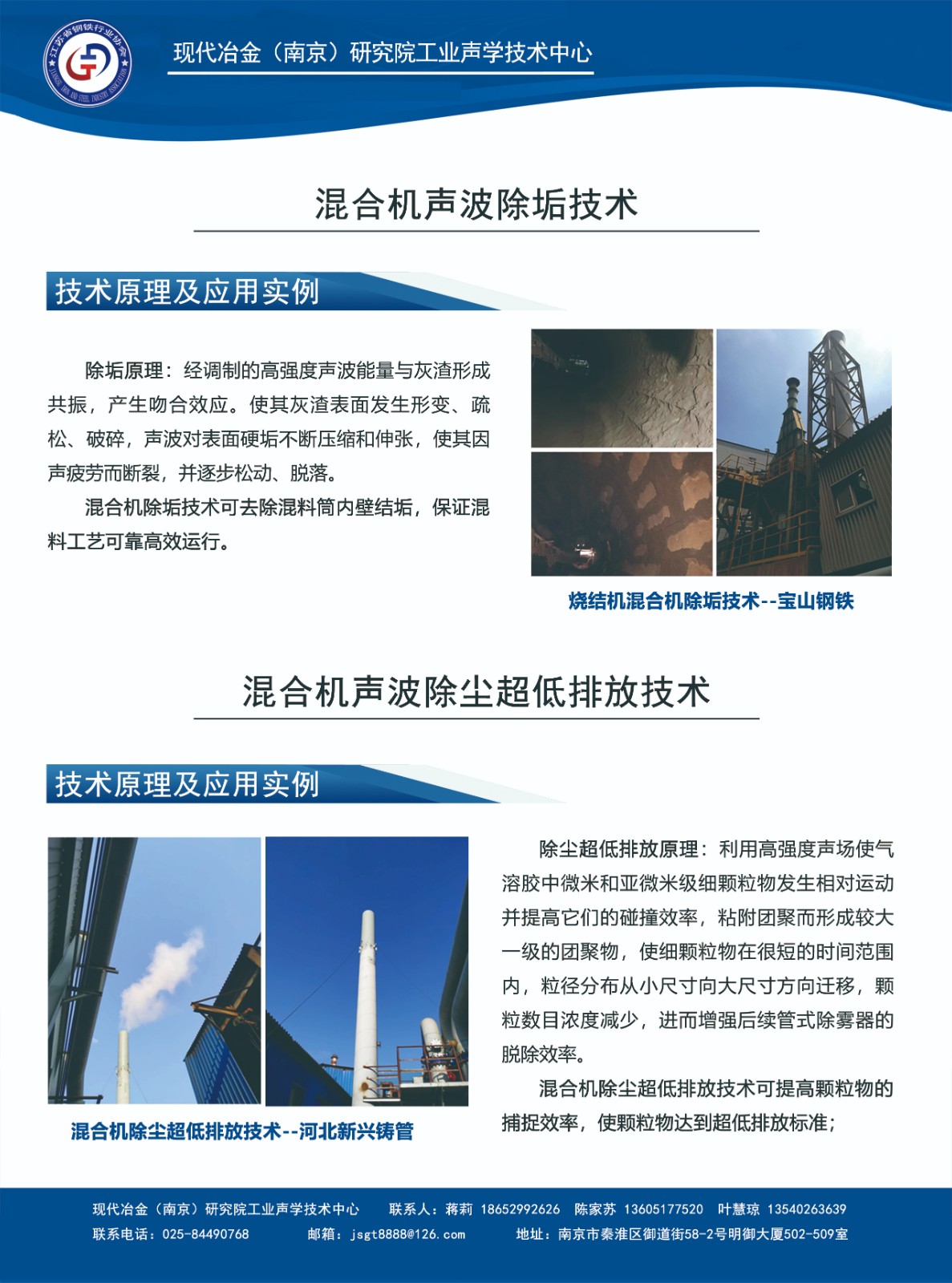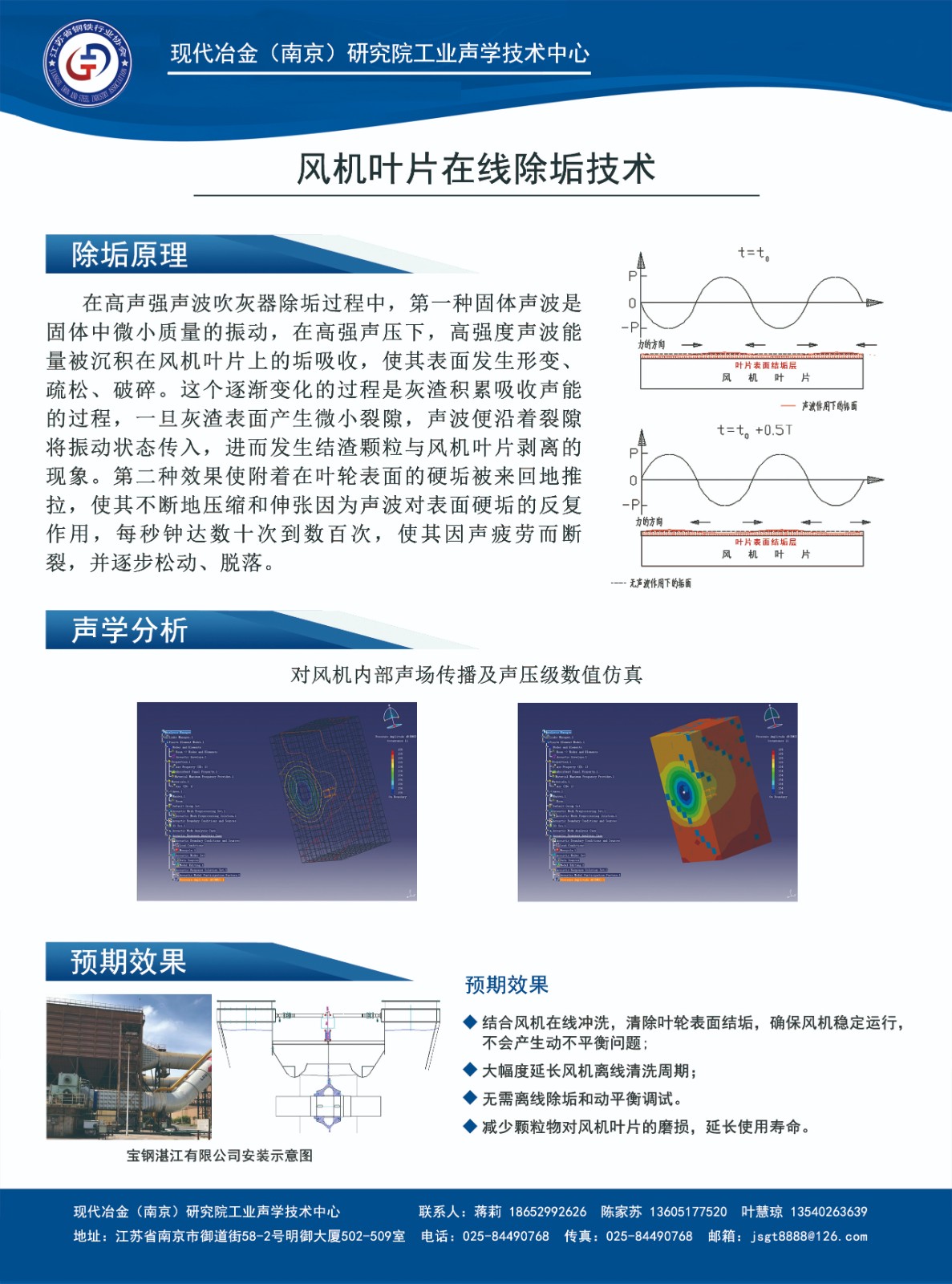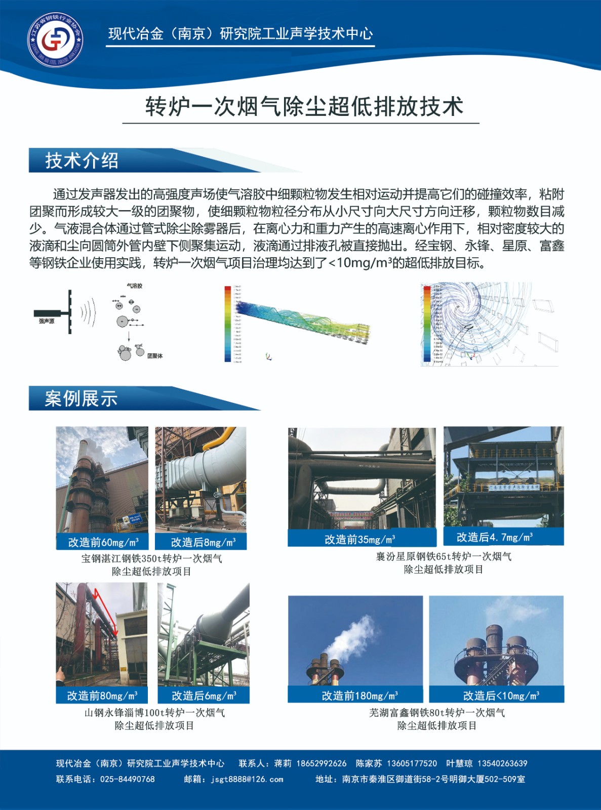 工业声学技术中心利用同频共振原理及高声强发生器,致力于转炉一次烟气高效除尘,混料筒壁、烟道冷却器、转炉一次除尘风机叶片清灰、除垢;利用无源干涉消声技术及微穿孔板共振吸声理论,致力于大型风机管道流场优化与噪声源节能降噪。