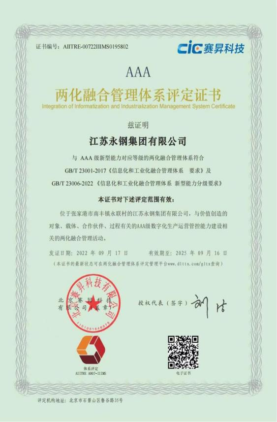 •17日,永钢集团正式通过国家工信部两化融合管理体系升级版(AAA级)贯标认证。