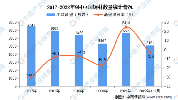 据统计,2022年1-9月中国钢材出口量5121万吨,同比减少3.4%。对于年产10亿吨这仅仅是九牛一毛,不值一提。