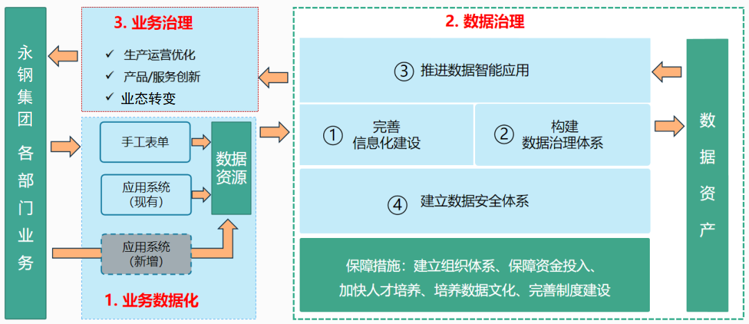 此前,永钢成功入选首批江苏省首席数据官制度试点企业,以CDO制度试点带动数据治理工作为新起点,积极形成自己的数据治理体系。 经过多年的数字化建设,永钢基本上实现了“一切业务数字化”,利用数字化技术赋能企业研发、生产、物流、采购、销售、服务等多个环节,实现了效率和体验的大幅提升,打通了核心业务流端到端,有效支撑公司的数字化生产与运营。 同时,公司还建立了全面的数据管理和数据应用制度,覆盖各数据职能领域的管理办法,以保证数据职能工作的规范性和严肃性。 未来,永钢将继续以数据质量提升为目标,坚定推进数据治理工作,构建数据管理与数据运营体系,推动数据向资源化、资产化加速蝶变,让数据成为推动永钢数字经济发展的新引擎,率先走出一条钢铁数据资产化的永钢路径,为实现创建“卓越的绿色钢铁材料服务商”的愿景提供强力支撑。