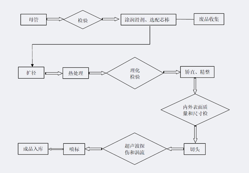 是将合格的成品钢管在控温、控速、控变径率的状态下,从头至尾经中频连续均匀加热,靠液压缸活塞的运动,使母管通过内置的锥形芯棒,扩制而成更大口径的钢管。