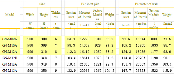 M型钢板桩,具有单个钢板桩的世界最大有效宽度-900mm,与现有尺寸的400mm、600mm相比在同等施工长度上,可以实现打桩块数、锁扣数量、渗水量的大幅减少且工期的缩短,施工费用的消减。