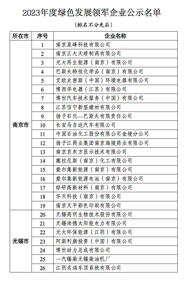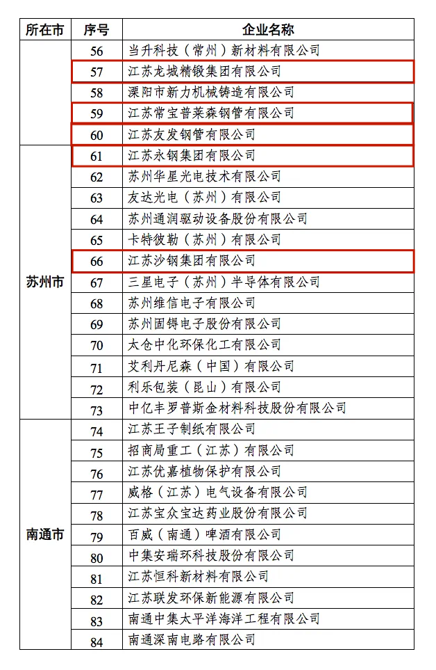 9月26日,江苏省生态环境厅与江苏省工商业联合会联合发布了“2023年度绿色发展领军企业”,其中共有7家钢铁企业入选,分别是江阴兴澄特种钢铁有限公司、江苏龙城精锻集团有限公司、江苏常宝普莱森钢管有限公司、江苏友发钢管有限公司、江苏永钢集团有限公司、江苏沙钢集团有限公司、江苏太平洋精锻科技股份有限公司。