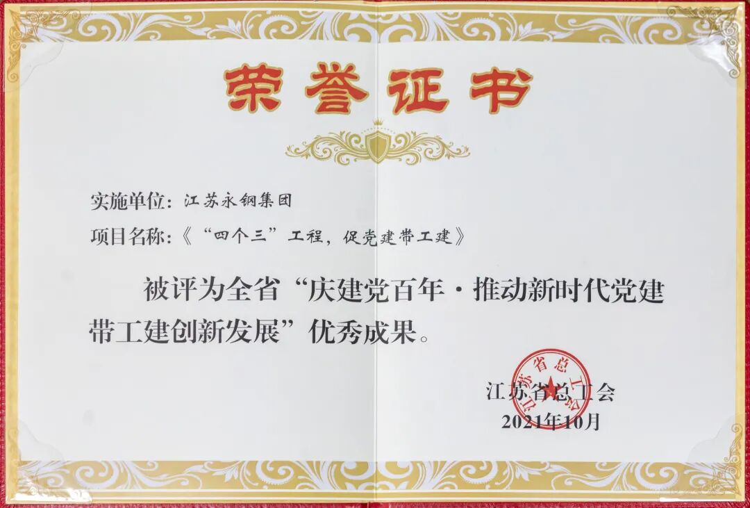 近日,江苏省委组织部、江苏省总工会在徐州召开全省“庆建党百年·推动新时代党建带工建创新发展”优秀成果发布会,会上命名表彰了20个优秀成果和48个典型案例,永钢集团《“四个三”工程 促党建带工建》项目获评“优秀成果”称号。
