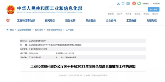 5月28日,为完善绿色制造体系,全面推行绿色制造,助力工业领域实现碳达峰、碳中和目标,工业和信息化部印发《关于开展2021年度绿色制造名单推荐工作的通知》,组织开展2021年度绿色制造名单推荐工作。