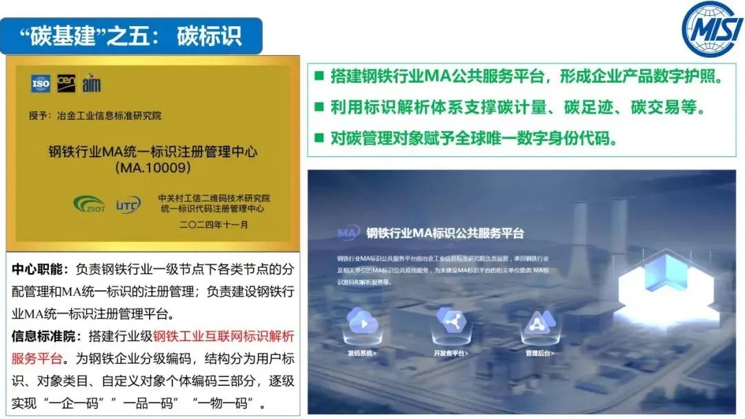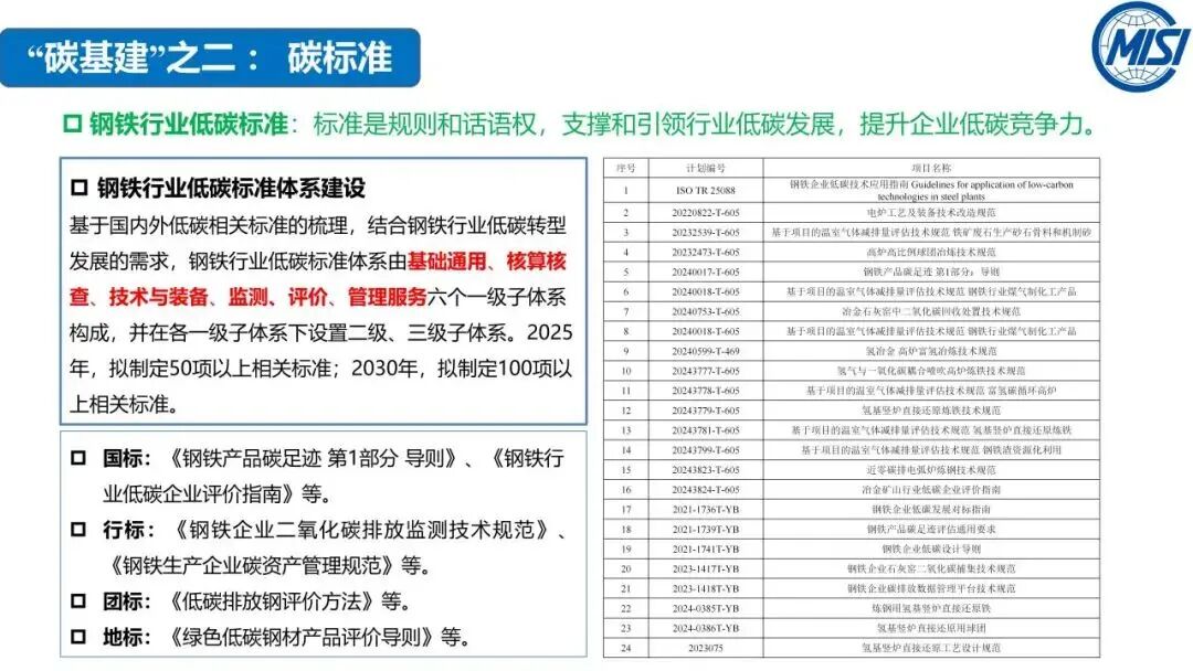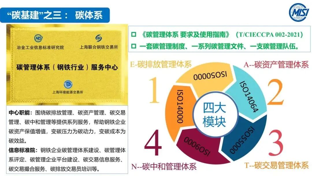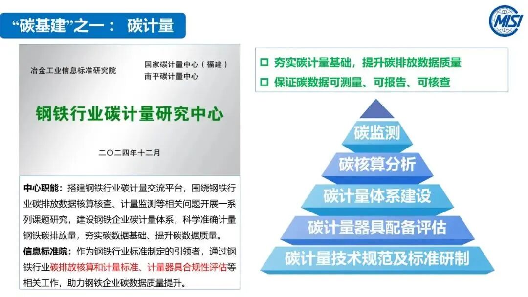 为落实能耗双控逐步转向碳排放双控政策要求,助力钢铁行业完成“十四五”节能降碳约束性指标,并加快构建碳排放双控体系,促进钢铁行业低碳高质量发展,冶金工业信息标准研究院研究并发布了钢铁企业“碳基建”综合方案,包含碳计量、碳标准、碳体系、碳平台、碳标识、碳管家等六大模块,全面提升钢铁企业碳管理基础能力。通过系统性能力构建,钢铁企业可将碳压力转化为技术革新、市场拓展和品牌升级的动力,最终在低碳时代实现“环境效益-经济效益-社会效益”的多维共赢,为钢铁行业纳入全国碳市场保驾护航。