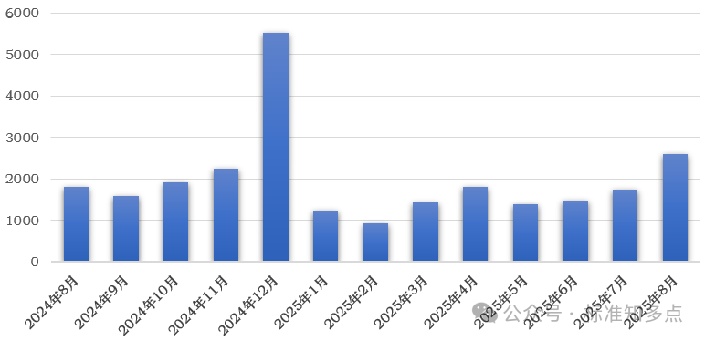 图 2024年8月-2025年8月每月新发布团标数量统计