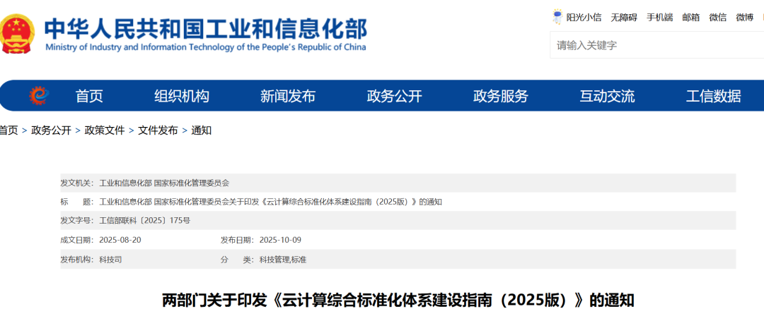 2025年10月9日,工业和信息化部、国家标准化管理委员会印发了《云计算综合标准化体系建设指南(2025版)》,本文从标准化工作角度进行简要解读。