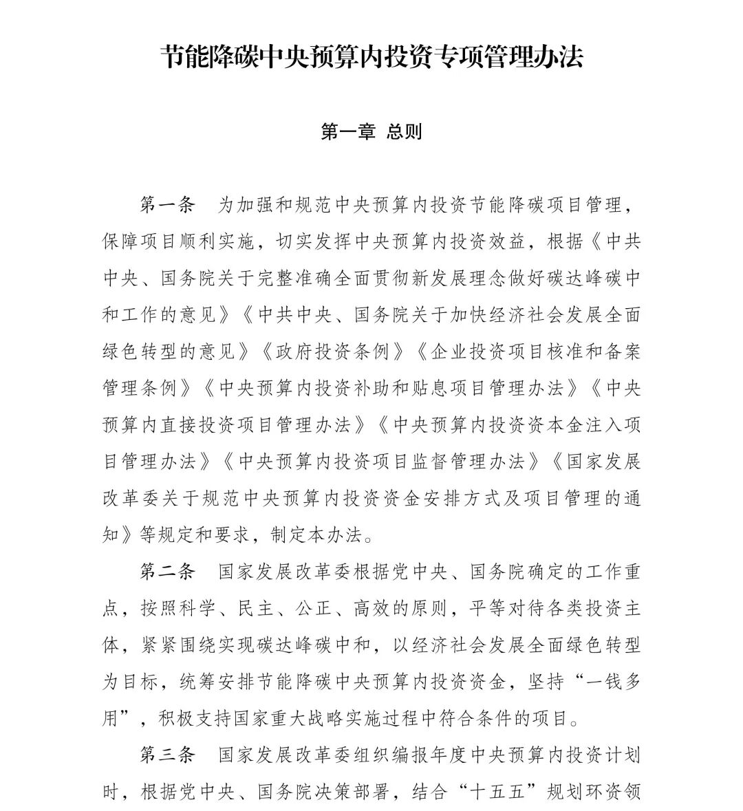 国家发展改革委关于印发《节能降碳中央预算内投资专项管理办法》的通知 发改环资规〔2025〕1228号 中直管理局,国管局,各省、自治区、直辖市及计划单列市、新疆生产建设兵团发展改革委: 为加强和规范节能降碳专项中央预算内投资管理,高质量推进项目建设,提高资金使用效益,我们制定了《节能降碳中央预算内投资专项管理办法》,现予印发,请遵照执行。 附件: 国家发展改革委 2025年9月19日