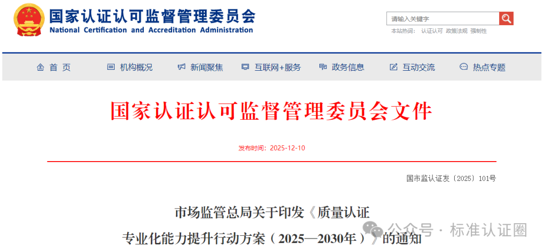 市场监管总局关于印发 《质量认证专业化能力提升行动方案(2025—2030年)》的通知 各省、自治区、直辖市和新疆生产建设兵团市场监管局(厅、委),中国合格评定国家认可中心,市场监管总局认证认可技术研究中心,中国认证认可协会,各认证机构: 《质量认证专业化能力提升行动方案(2025—2030年)》已经2025年11月24日市场监管总局第26次局务会议通过,现印发给你们,请结合实际认真贯彻落实。 市场监管总局 2025年11月27日