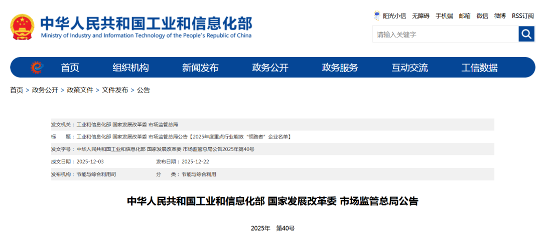 12月22日,工业和信息化部、国家发展改革委、市场监管总局三部门发布了2025年度重点行业能效“领跑者”企业名单,其中钢铁行业武汉钢铁有限公司、首钢京唐钢铁联合有限责任公司、山东钢铁集团日照有限公司、成都冶金实验厂有限公司四家企业上榜。
