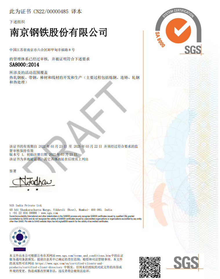 SA8000(Social Accountability 8000 International Standard)是全球首个道德规范国际标准,对企业建立国际公信力、与客户建立正面情感、获取合作伙伴长期合作信心、实现人性化管理等方面产生积极影响。南钢是行业内率先组织SA8000体系认证的企业之一,充分体现了南钢在人文理念、管理制度等多个维度对社会责任的积极践行。南钢SA8000体系建设工作,历经调查摸底、组建内审员队伍、开展培训、文件编写、体系内审、管理评审等程序,于2022年3月顺利通过了通标标准技术服务有限公司的认证。