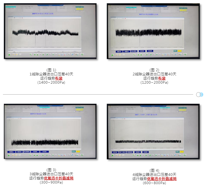 众所周知,折叠滤筒相比于传统布袋的一大优势在于高效低阻运行效果,由此带来的系统阻力的降低,提升了风机的效率,达到了节能效果,同时滤筒低阻力运行,一定程度上缓解了对喷吹系统的依赖,降低了气体的消耗,从而延长滤筒的使用寿命。优氪迅®折叠滤筒能够做到高效低阻的运行效果,主要得益于滤筒本身的导流结构设计及采用通透性更好的聚酯PTFE覆膜滤料,将表面过滤、高通透性能、导流结构设计发挥到极致。通过比对大量的升级改造或新建超低排放项目的实际运行数据,优氪迅®折叠滤筒都能够很好的展现高效低阻的优越性能。