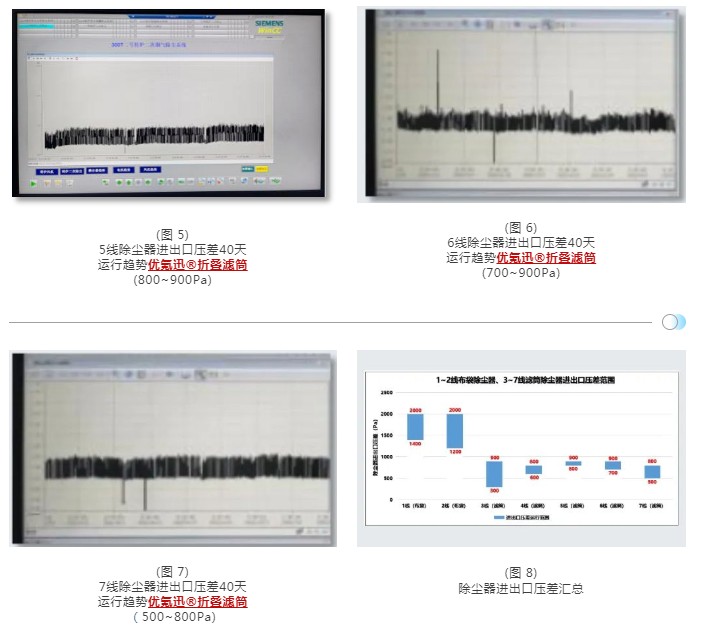 通过上面组图所展示的7条线近40天除尘器进出口压差趋势图及汇总对比表可以明显得出,7条线采用不同方案同期完成技改后的运行状况一目了然,1、2线除尘器进出口压差明显高出3~7线,也明显看出安装折叠滤筒的除尘器系统压差不仅在数值上低于布袋,并且压差范围更小,压差稳定。