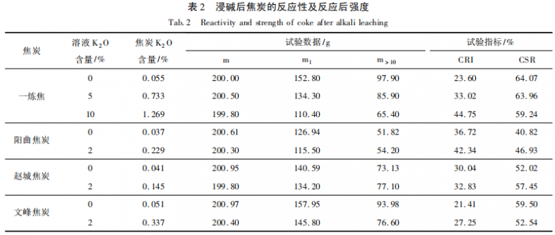 为考察碱金属行为对焦炭热性能的影响,对浸碱后焦炭的热态性能进行了试验。K2O含量及焦炭的热态性能指标变化情况如表2所示。