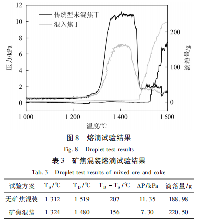 试验加入的焦丁量按计算溶损反应碳消耗量的40%与矿石混合加入。熔滴试验对比如图8和表3所示。