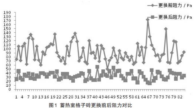 (2)施工采取在线格子砖更换及三班倒连续作业方式,蓄顶温度基本控制在800℃以上;格子砖更换后,没有对炉体造成二次伤害,蓄热室密封性良好,基本解决了蓄热室煤气泄漏问题。